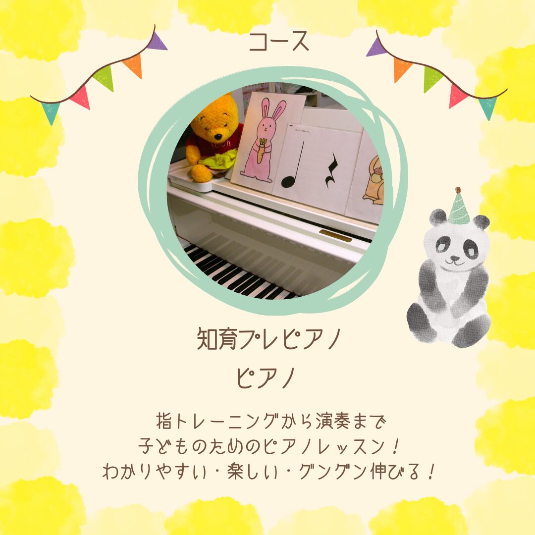 | ♪知育プレピアノ (2歳~3歳児) | ~ピアノ入門コースです。 ♪リトミックもしながら、手作り絵楽譜を使ってピアノにもチャレンジ!自然にピアノが好きになっていきます。 |