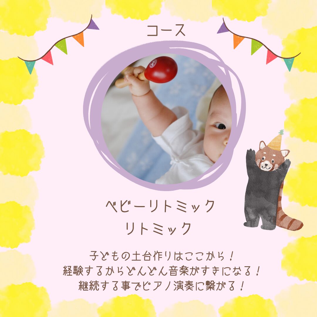 | ♪ベビーリトミック (0歳6ヶ月~) パーソナルレッスン | ~見て!触れて!聴いて!ママと一緒に、生演奏に合わせてゆっくり小さく上下運動を体験します。 寝返り、ハイハイ、お座り、立つなどの動作の発達を促します。また、音の高低に合わせて視野を変化させる事で、視覚機能や平衡感覚も鍛えれます。 |